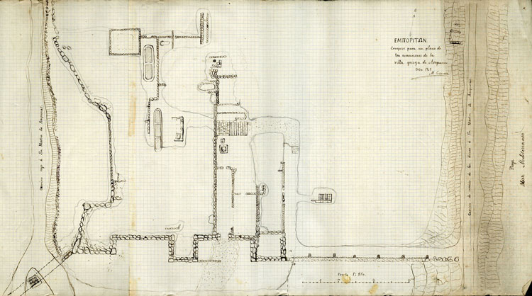 Dessin du niveau de la zone méridionale de la néapolis d’Empúries. Une partie des murailles et la stoa y sont représentées. 1909. Plan réalisé par Manuel Cazurro.
